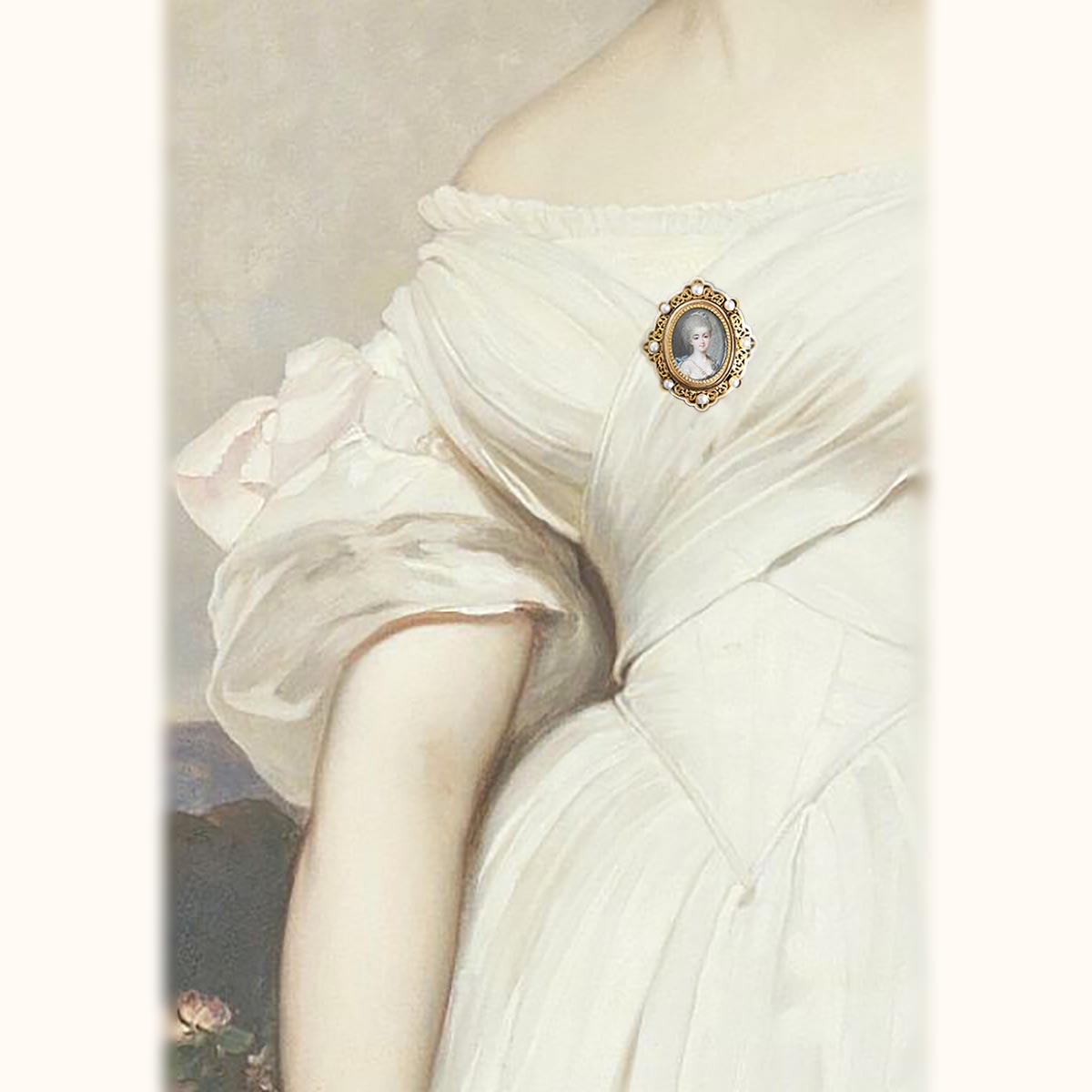 フランスの美術館に保存されているクオリティの、優雅な貴婦人像が魅力のアンティーク・ミニアチュール・ブローチです。