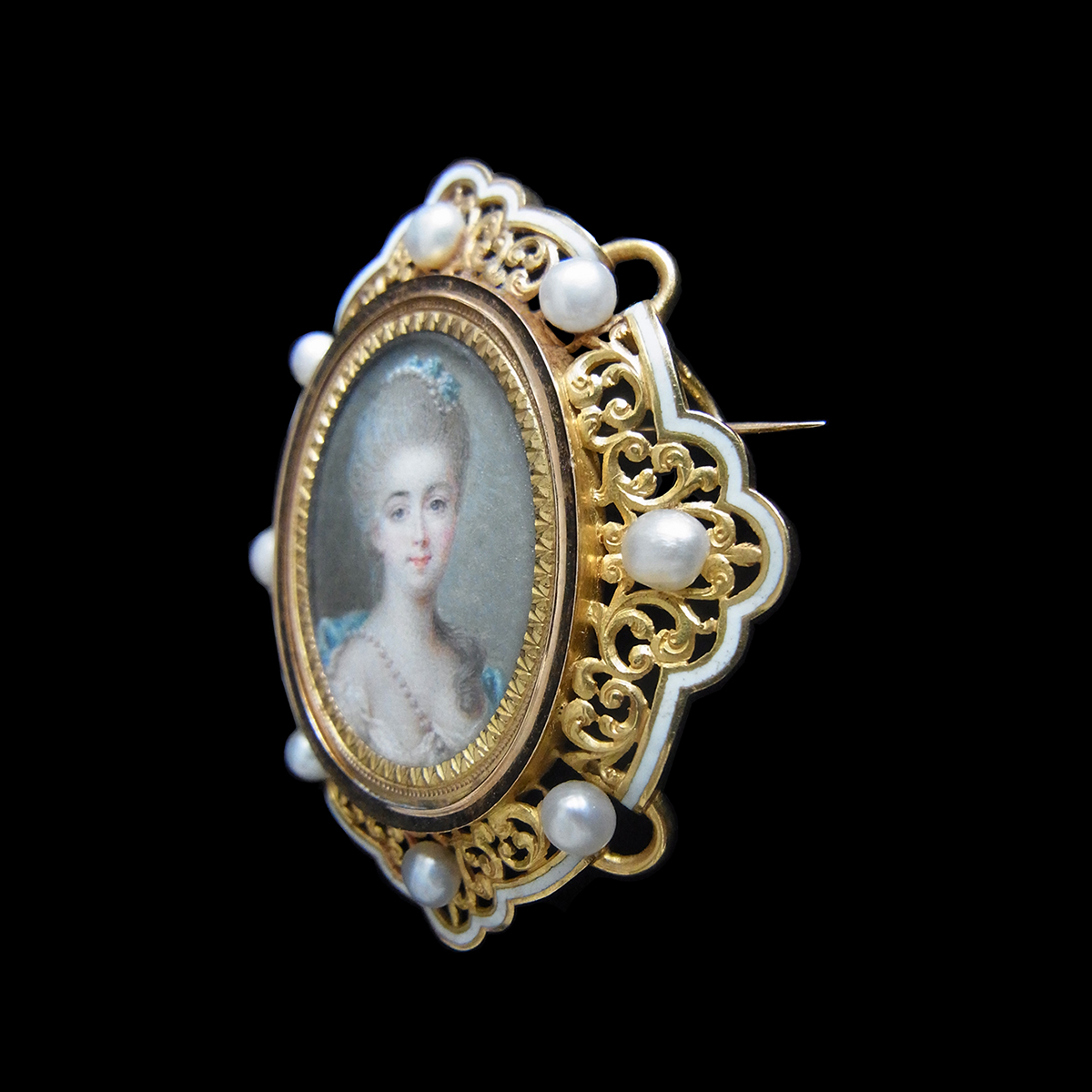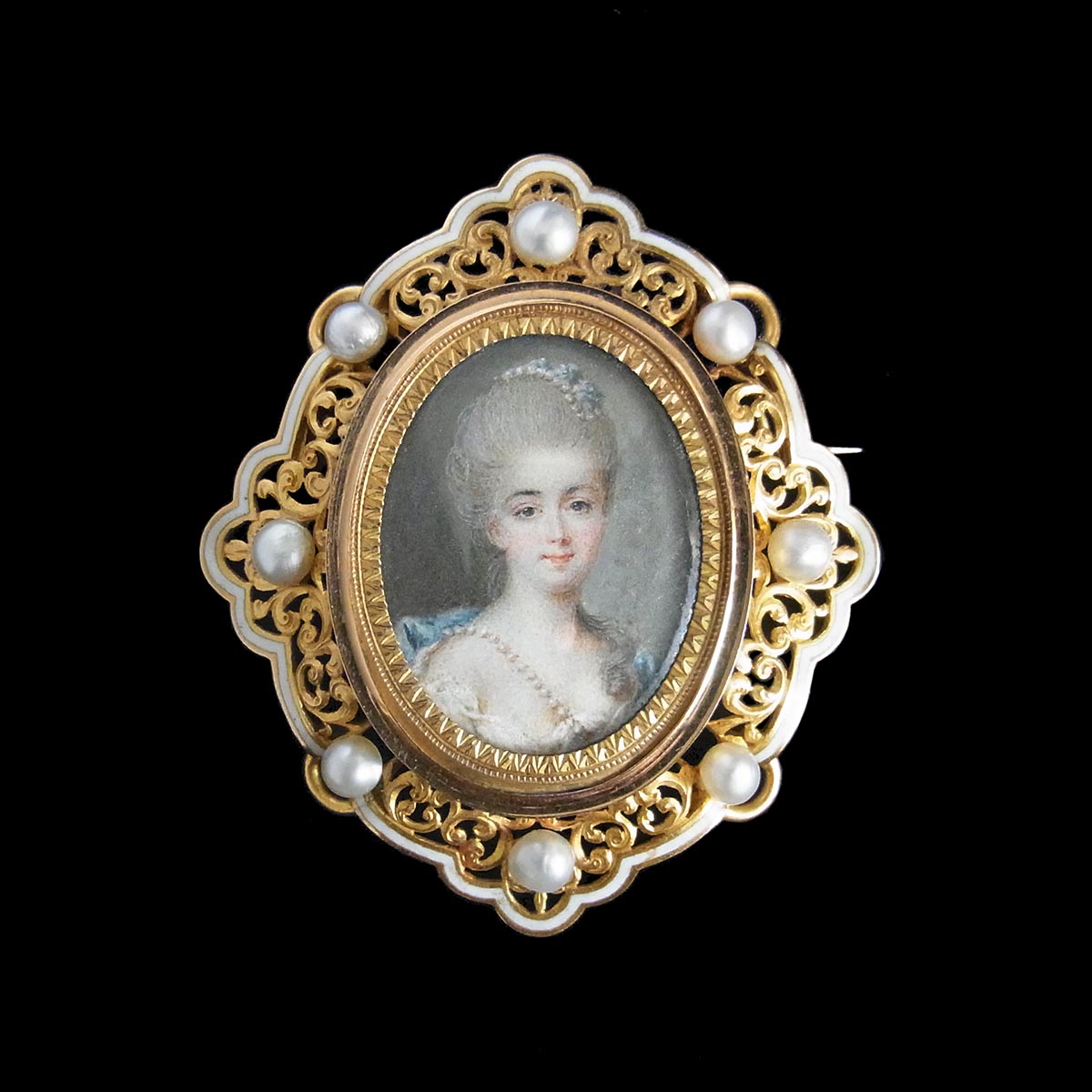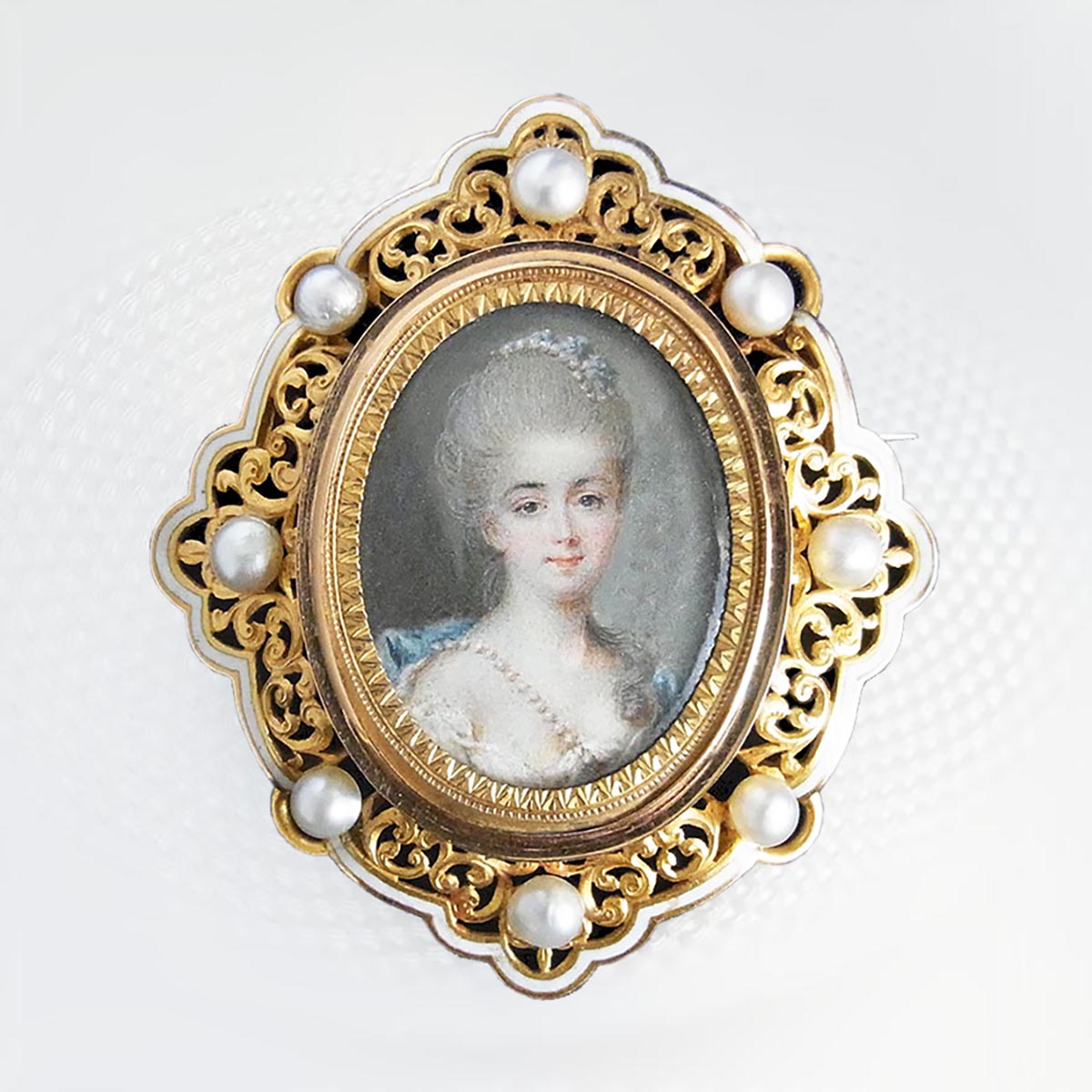 フランスの美術館に保存されているクオリティの、優雅な貴婦人像が魅力のアンティーク・ミニアチュール・ブローチです。