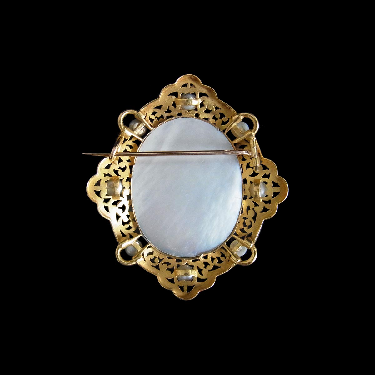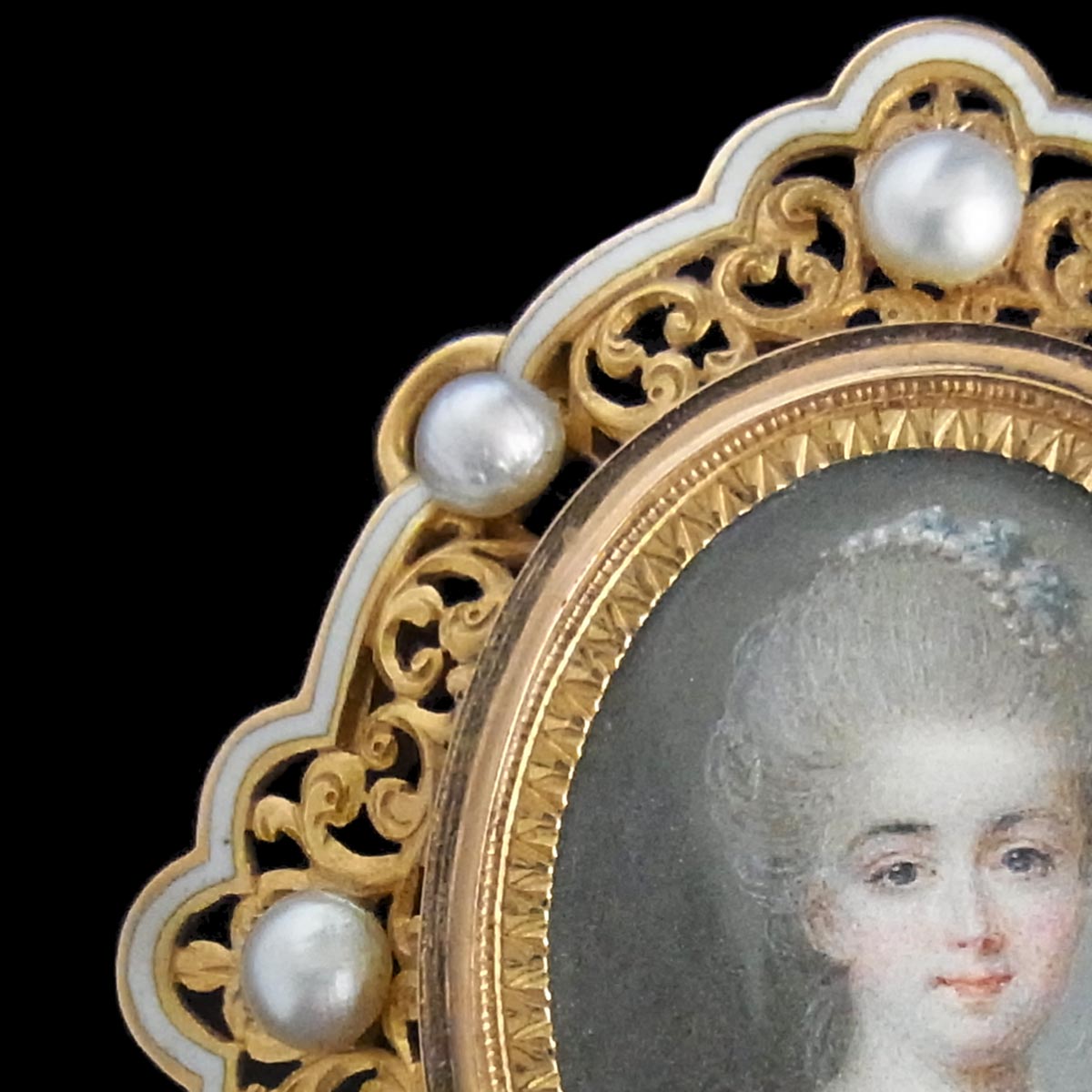 Materials: Miniature painting, 18K Gold, Enamel, Natural pearl, Mother-of-pearl