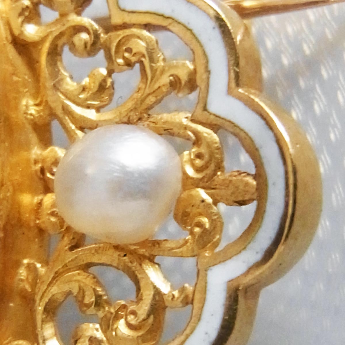 素材:ミニアチュール・18金・エマイユ・天然真珠・真珠母貝