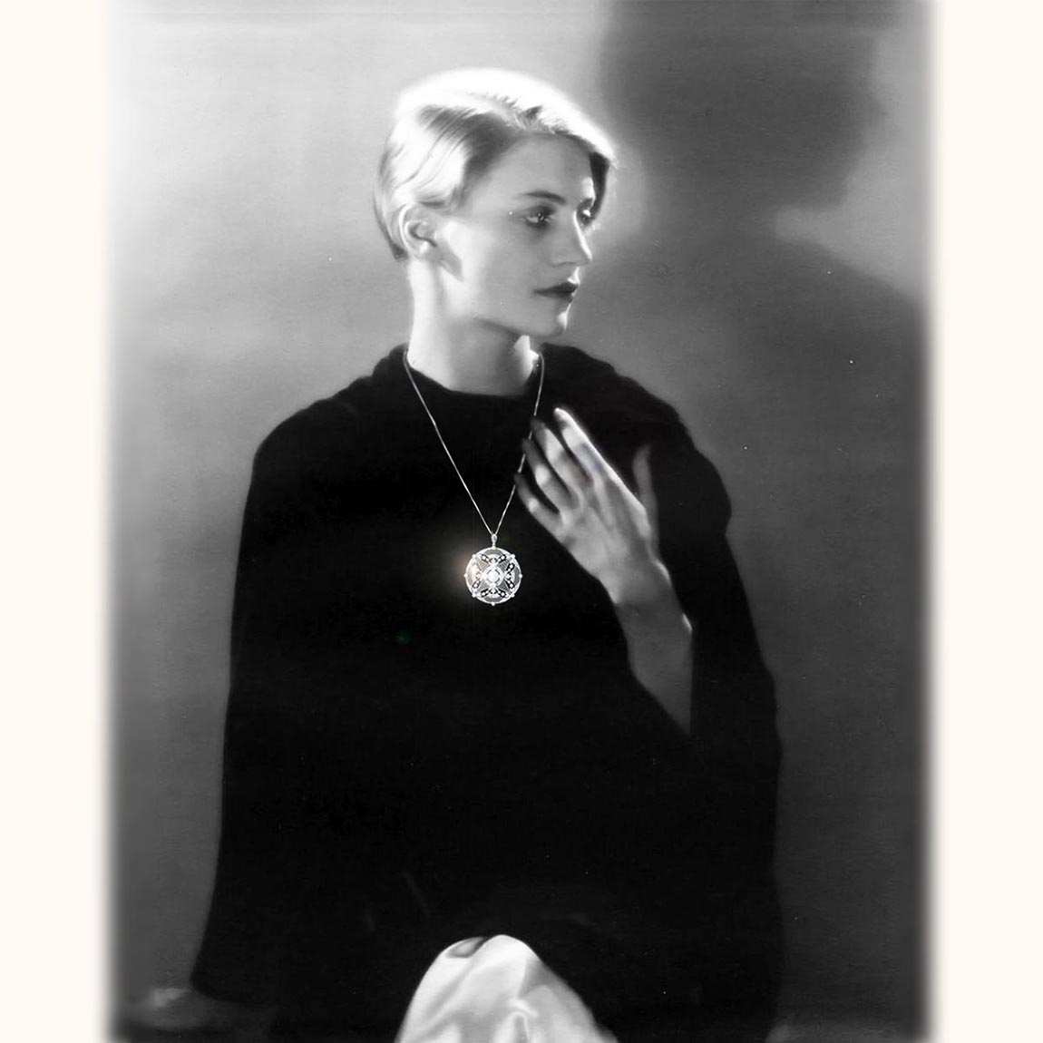当時は、他のダイヤモンドのロングネックレスや、真珠のネックレスと重ねて着けるスタイルも好まれましたから、華やかな場ではそのような着け方も素敵です。