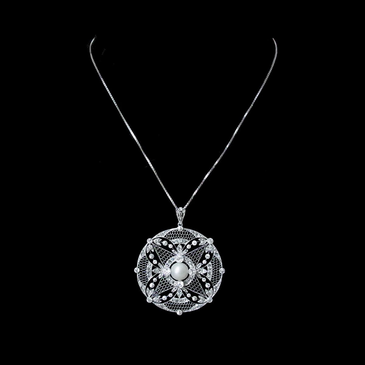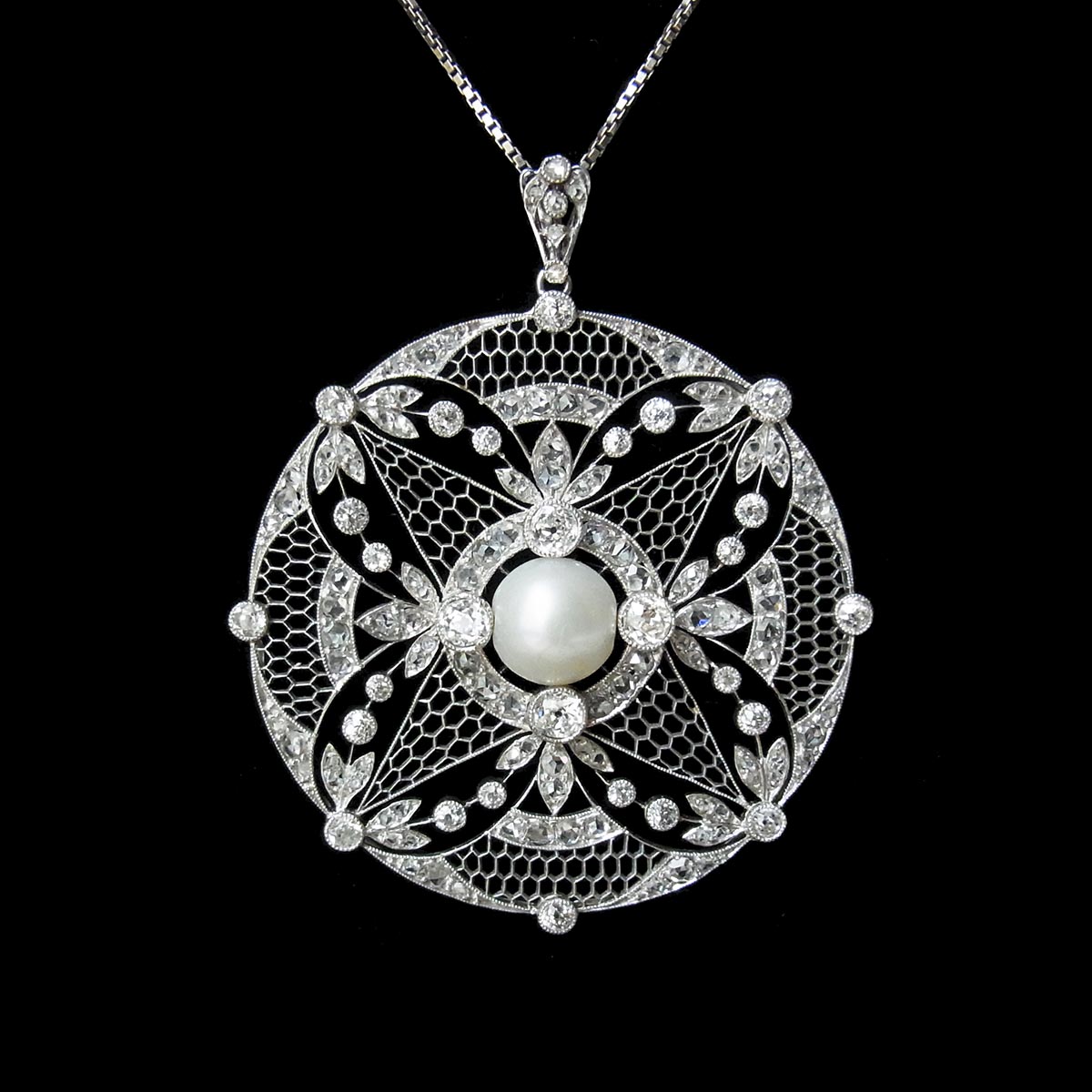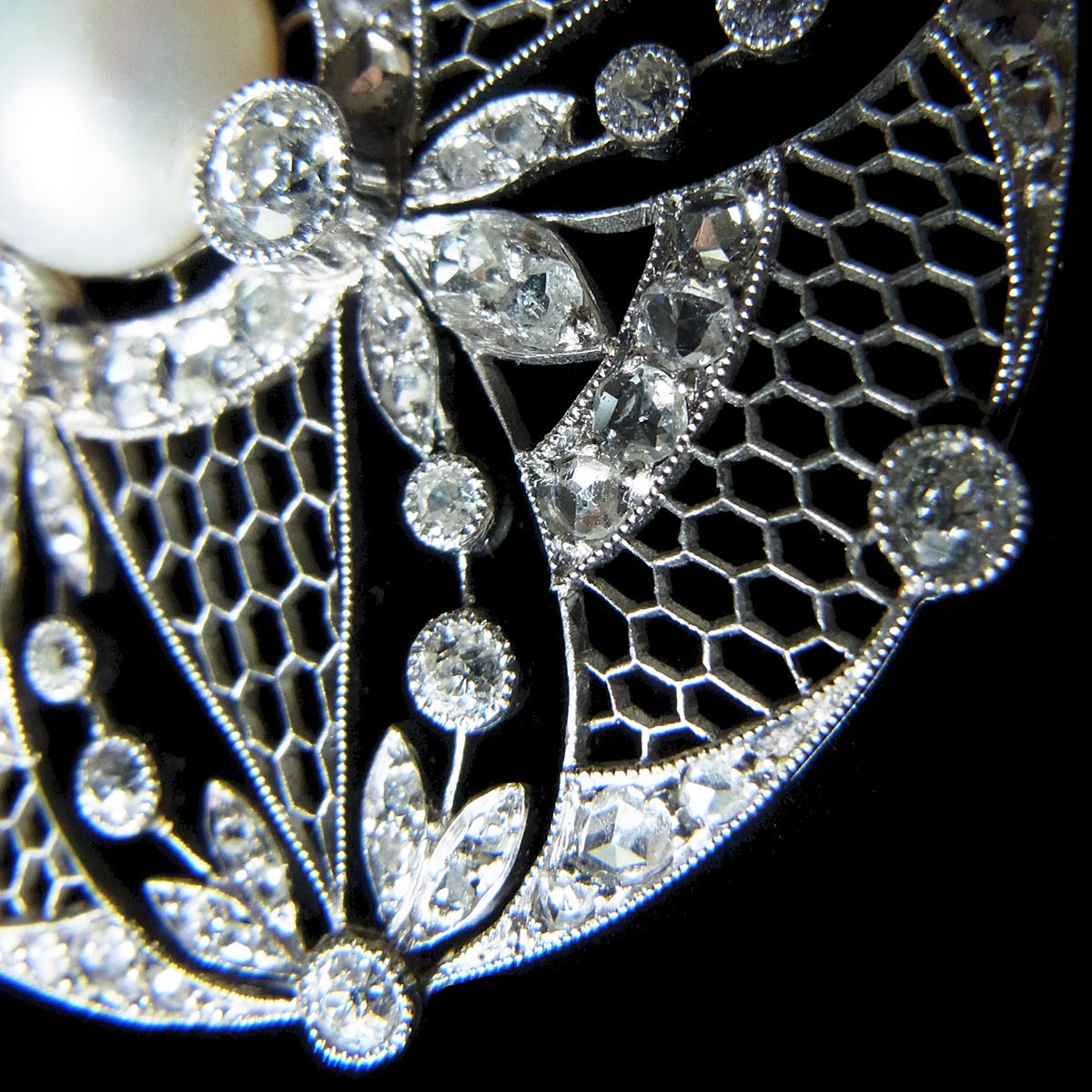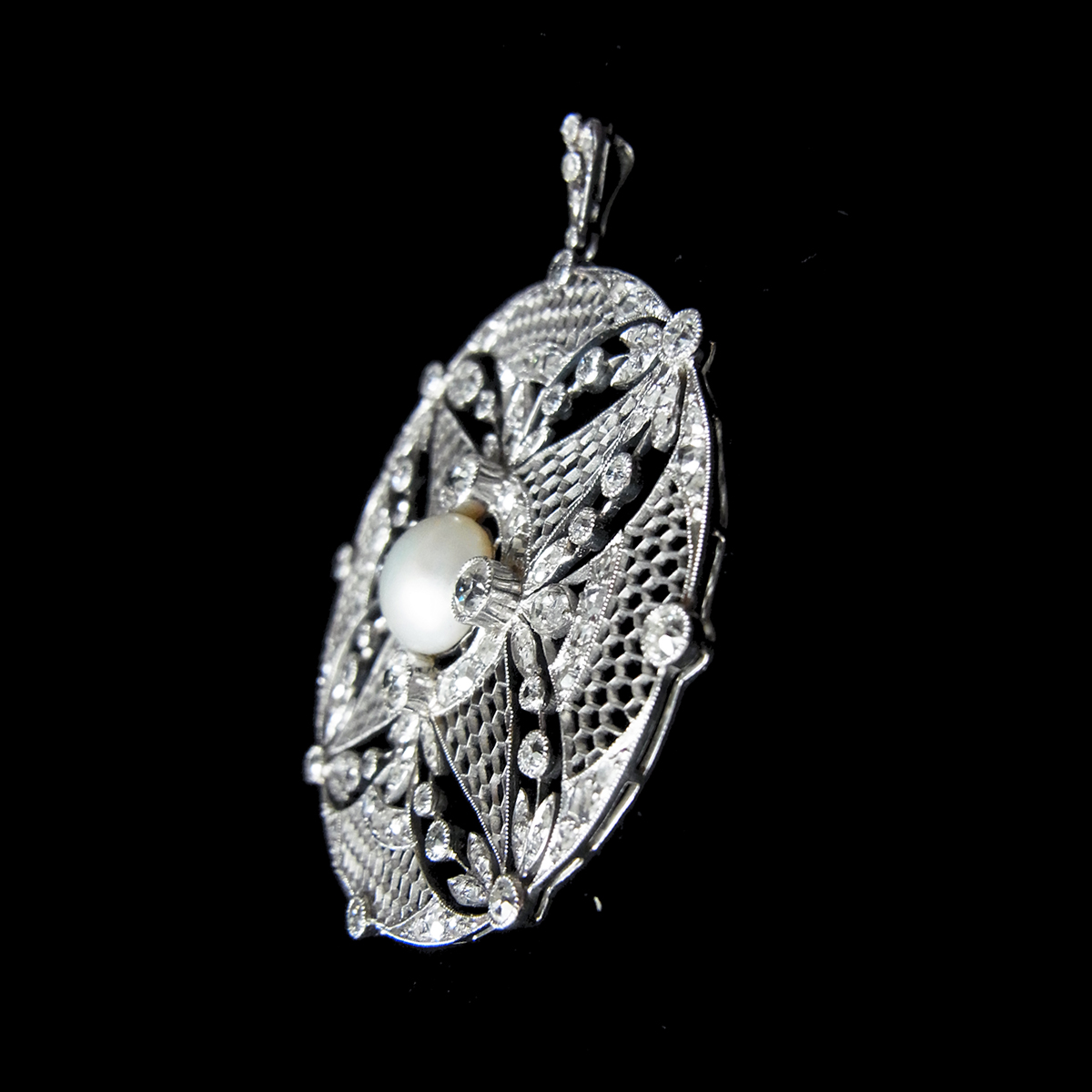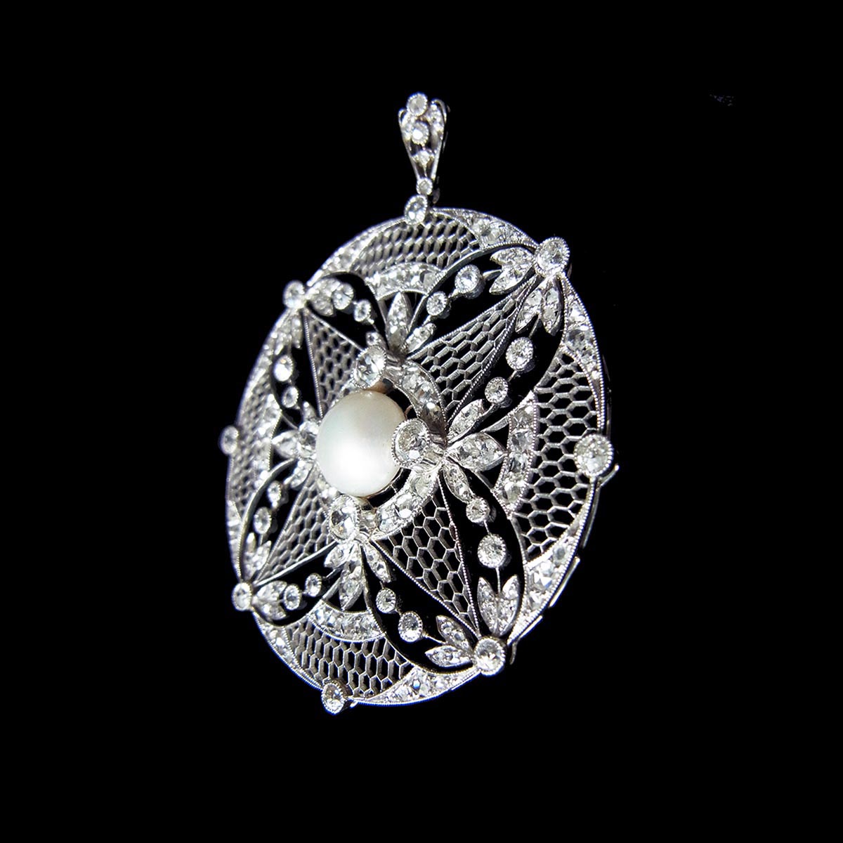 べル・エポック期(※ 下記参照)という時代の作品で、プラチナ製のフレームに、中央に天然真珠、周囲全体にダイヤモンドをセッティングしています。